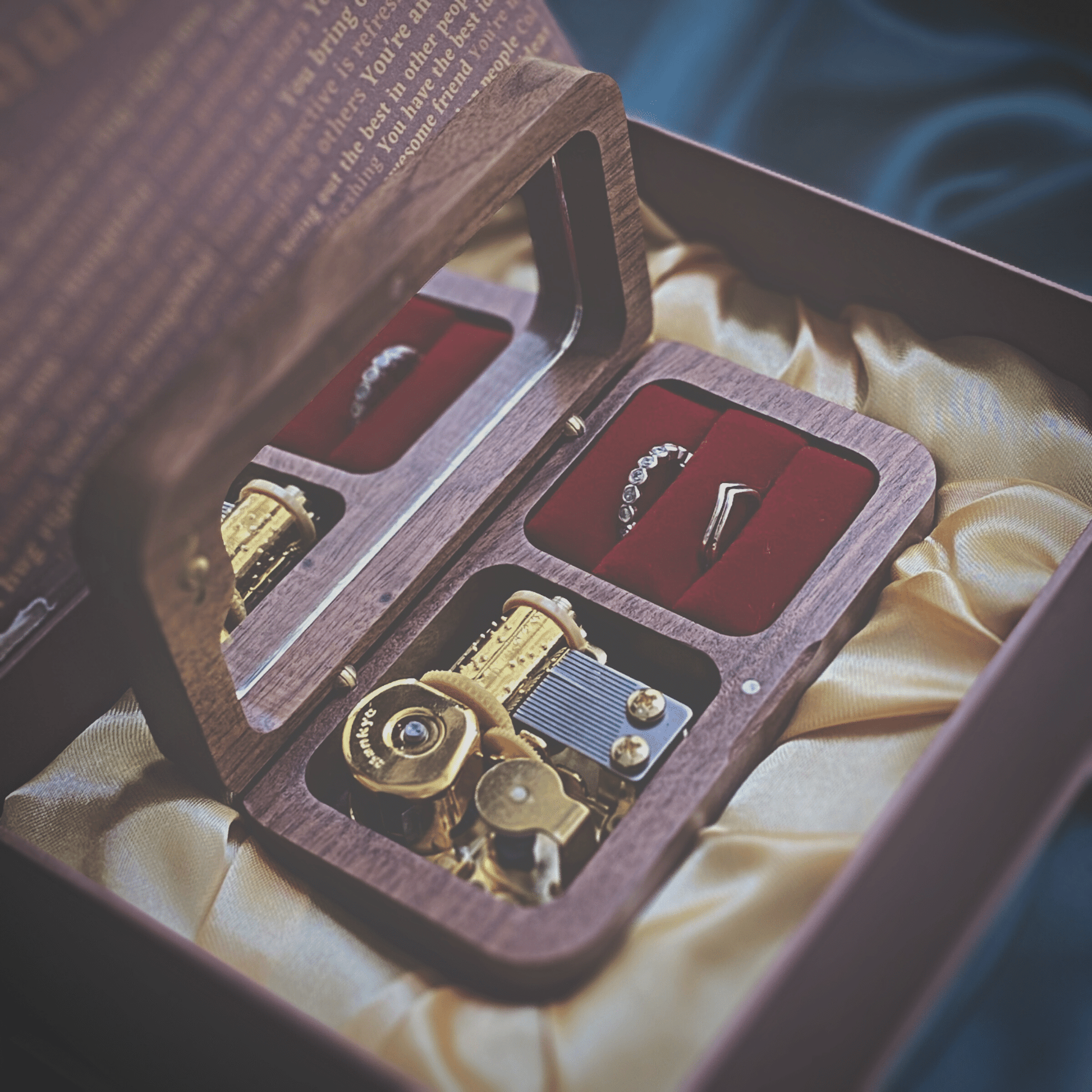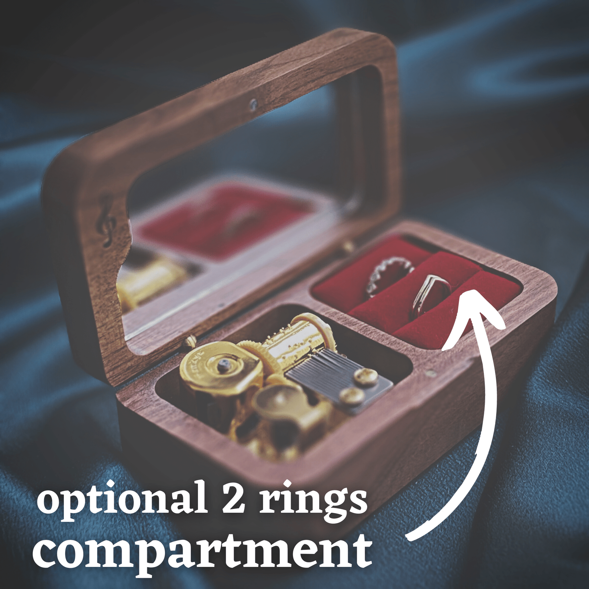 Elegant wooden Ring Holder music box. Ideal for proposal, engagement, and wedding rings! Start playing your favorite tune the moment the box is opened, to elevate the element of surprise. Certainly makes for a perfect gift!